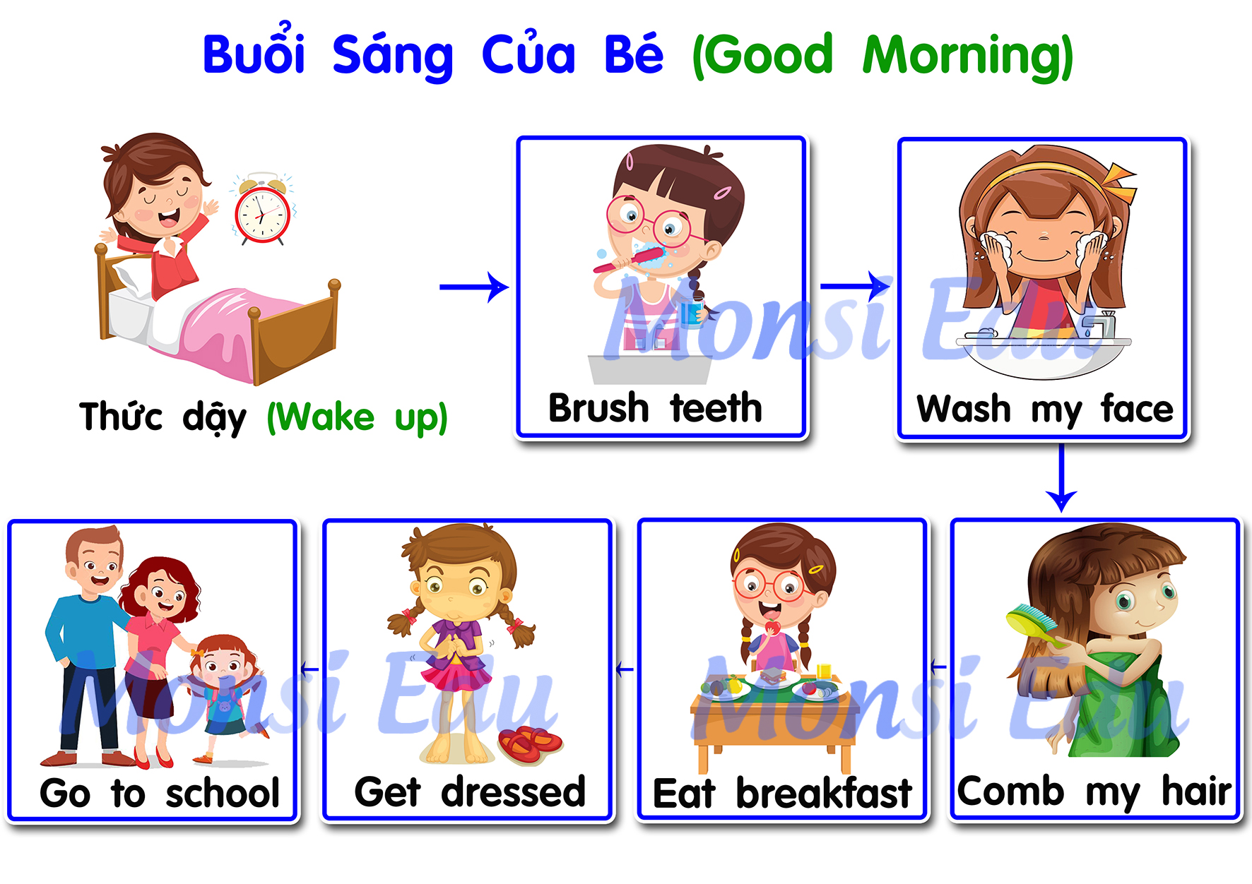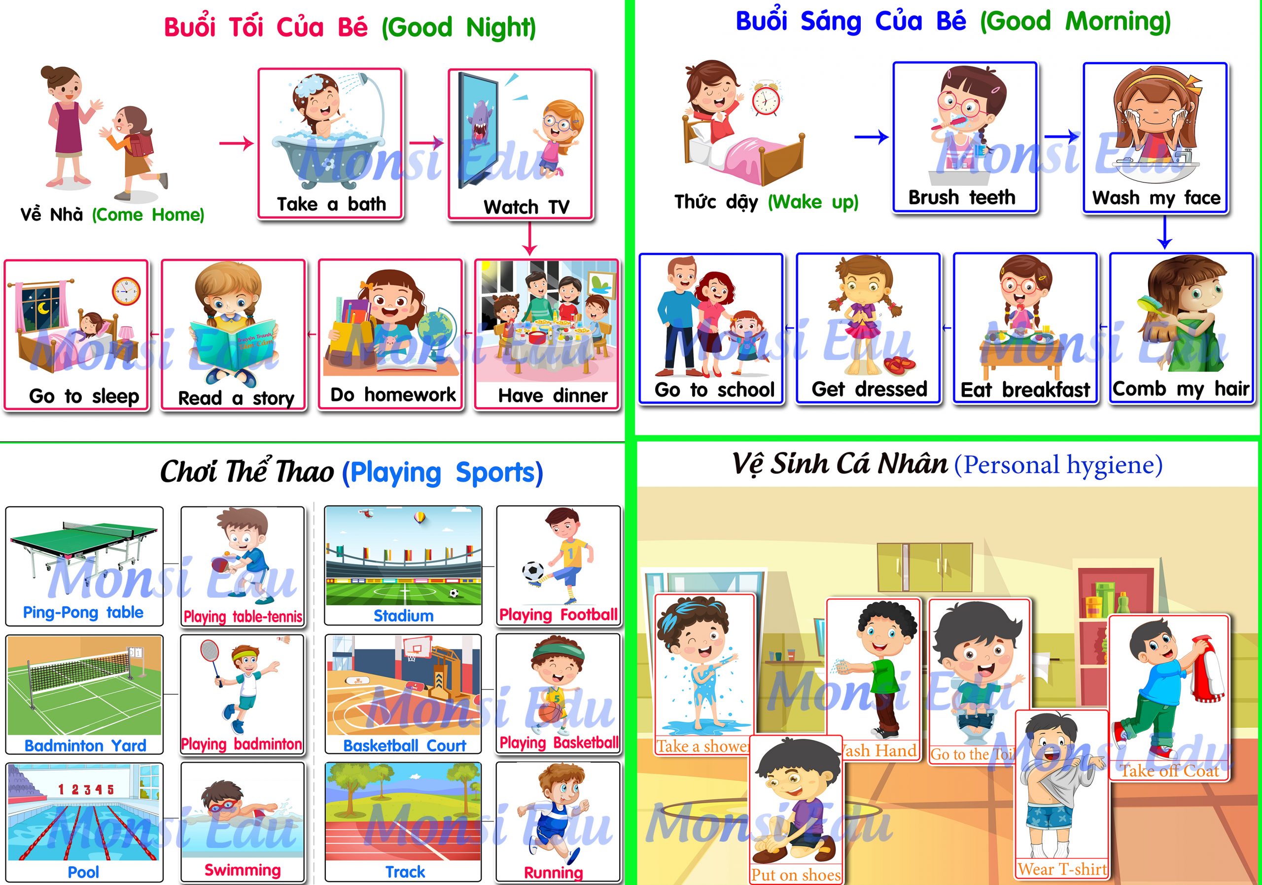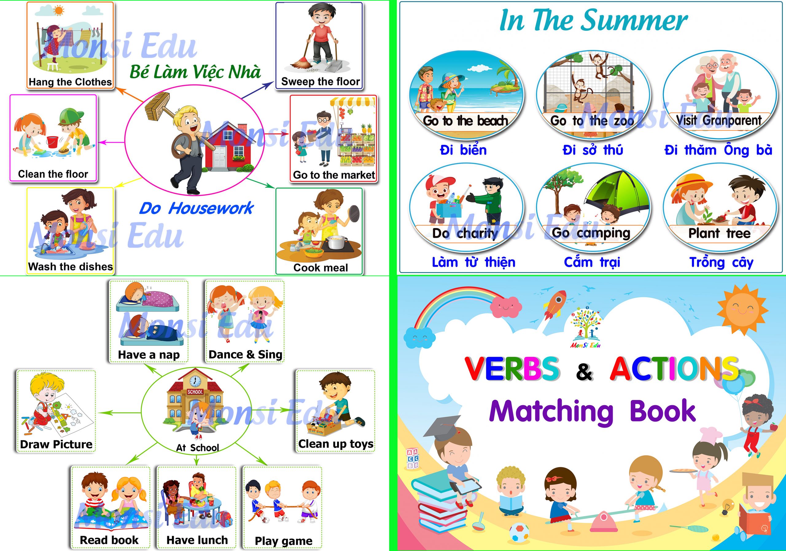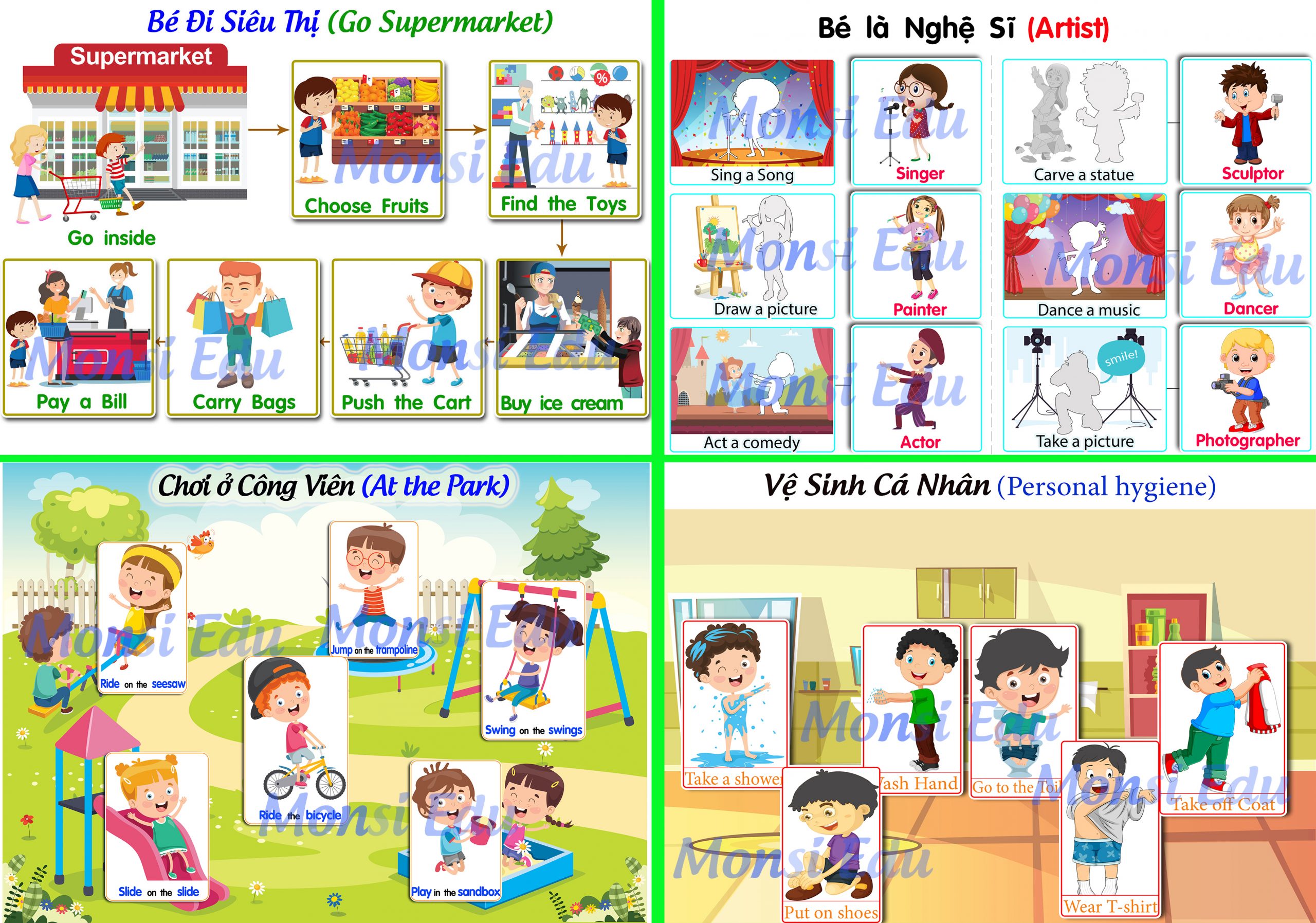 Gồm 10 chủ đề, các chủ đề xoay quanh hành động cuộc sống xung quanh Bé:  Chuỗi hành động vào buổi sáng hay buổi tối, hành vi – thói quen khi vệ sinh, hoạt động vui chơi ở công viên, … Các chủ đề được trình bày nhiều dạng: Ghép cặp, Sơ đồ tư duy, Bóng nền, Theo thứ tự quy trình, …